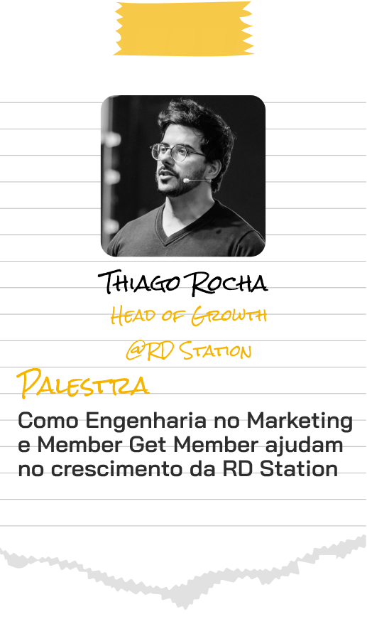 | 16:30 | Palestra | Thiago Rocha | Como Engenharia no Marketing e Member Get Member ajudam no crescimento da RD Station |