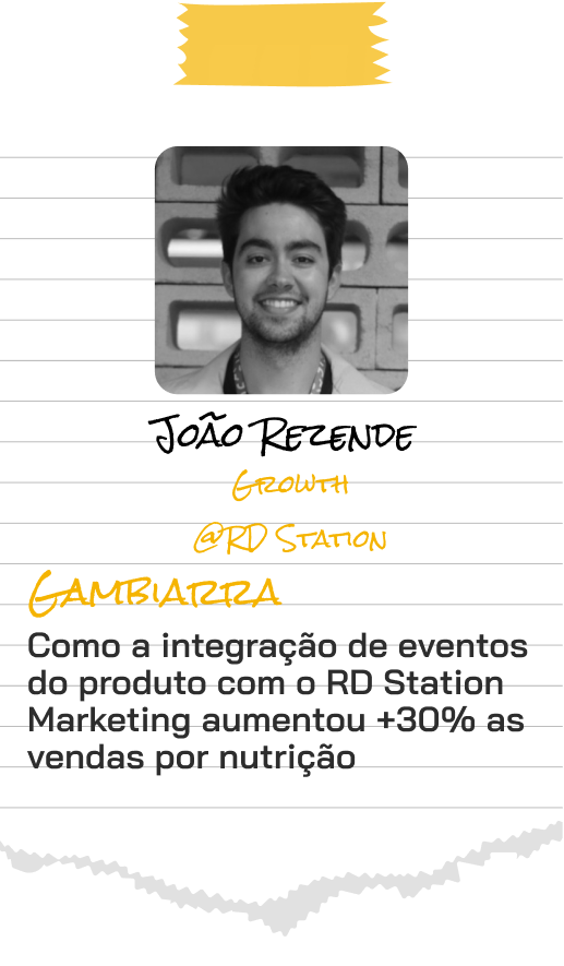| 09:50 | Gambiarra | João Rezende | Como a integração de eventos do produto com o RD Station Marketing aumentou as vendas em +30% |