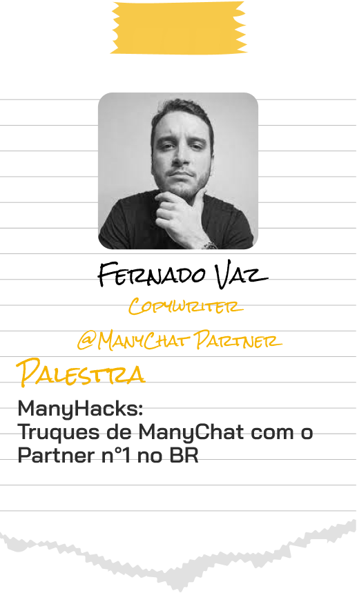 | 15:50 | Palestra | Fernado Vaz | ManyHacks: Truques de ManyChat com o Partner n° 1 no BR |