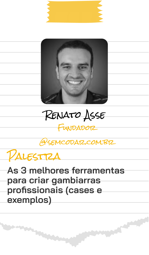 | 09:55 | Palestra | Renato Asse | As 3 melhores ferramentas para criar gambiarras profissionais: cases e exemplos |
