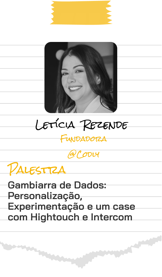 | 14:00 | Palestra | Letícia Rezende | Gambiarra de Dados: Personalização, Experimentação e um case com Hightouch e Intercom |