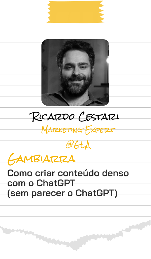 | 11:30 | Gambiarra | Ricardo Cestari | Como criar conteúdo denso com o ChatGPT (sem parecer o ChatGPT) |
