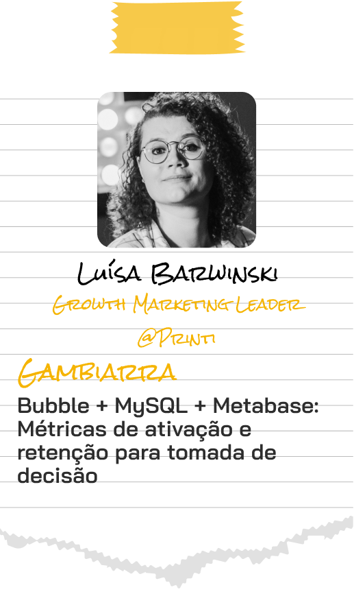 | 14:40 | Gambiarra | Luísa Barwinski | Bubble + MySQL + Metabase: Métricas de ativação e retenção para tomada de decisão |