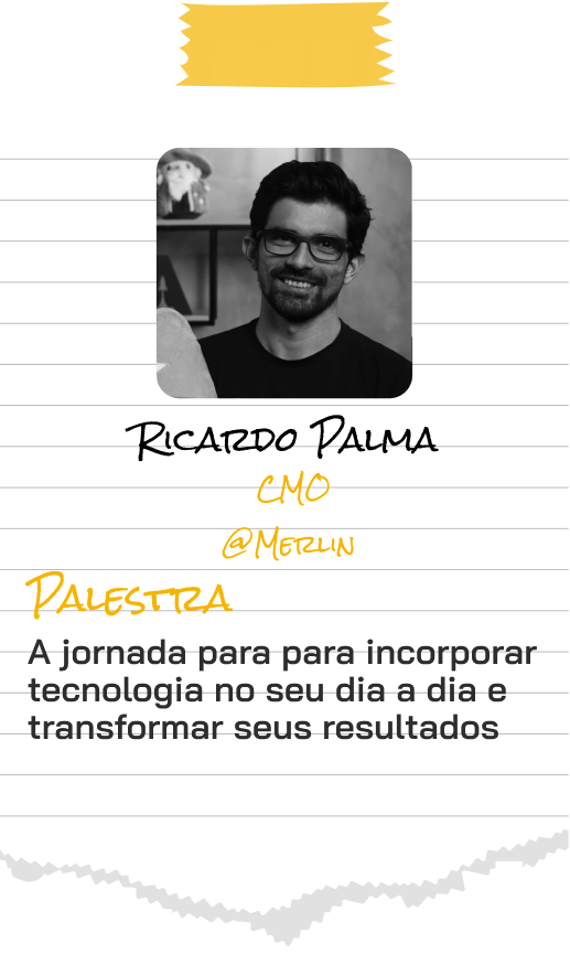 | 11:00 | Palestra | Ricardo Palma | A jornada para incorporar tecnologia no seu dia a dia e transformar seus resultados |
