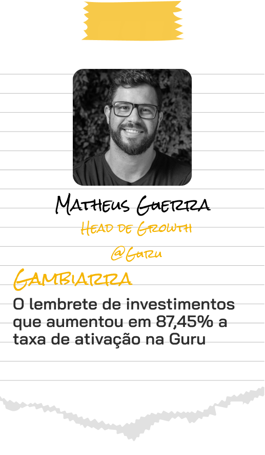 | 14:20 | Gambiarra | Matheus Guerra | O lembrete de investimentos que aumentou em 87,45% a taxa de ativação na Guru |