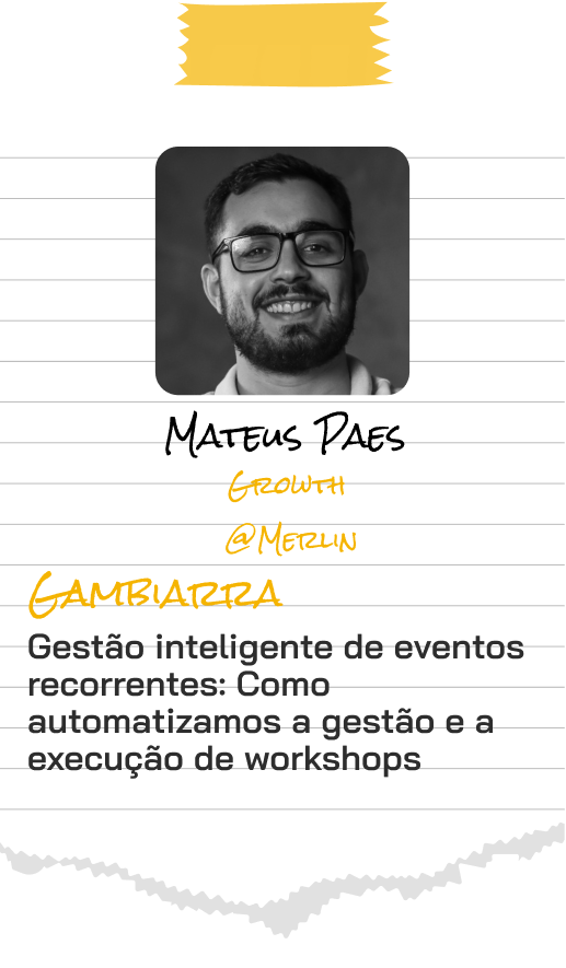 | 14:00 | Gambiarra | Mateus Paes | Gestão inteligente de eventos recorrentes: Como automatizamos a gestão e a execução de workshops |