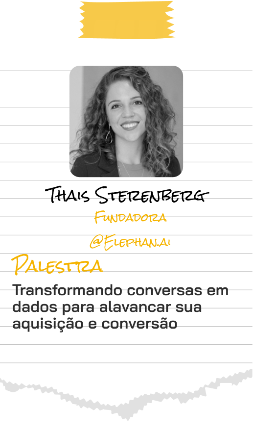 | 15:00 | Palestra | Thais Sterenberg | Transformando conversas em dados para alavancar sua aquisição e conversão |