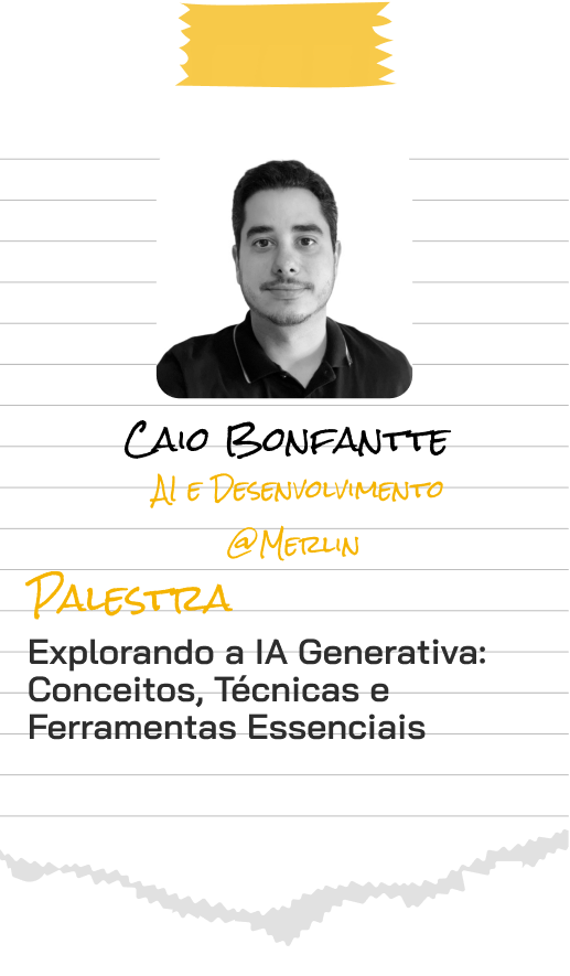 | 13:10 | Palestra | Caio Bonfante | Explorando a IA Generativa: Conceitos e Ferramentas Essenciais |