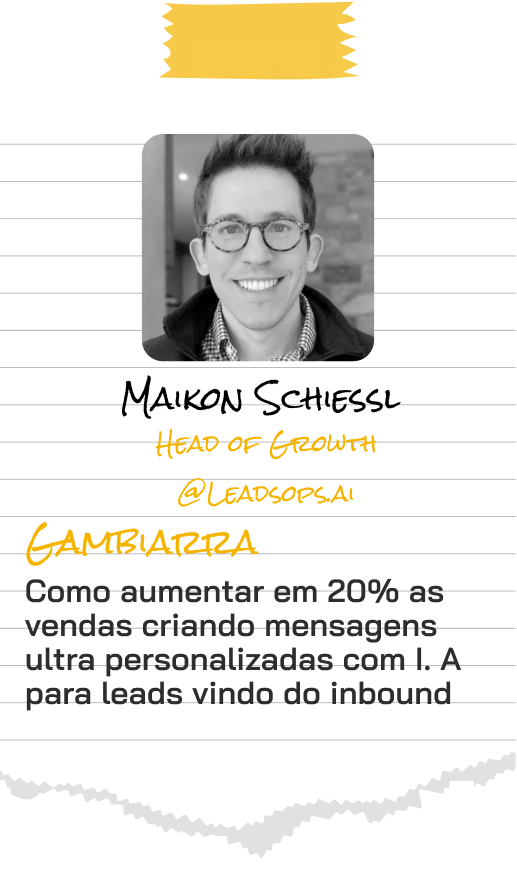 | 13:30 | Gambiarra | Maikon Schiessl | Como aumentar em 20% as vendas criando mensagens ultra personalizadas com I.A. para leads vindo do inbound |
